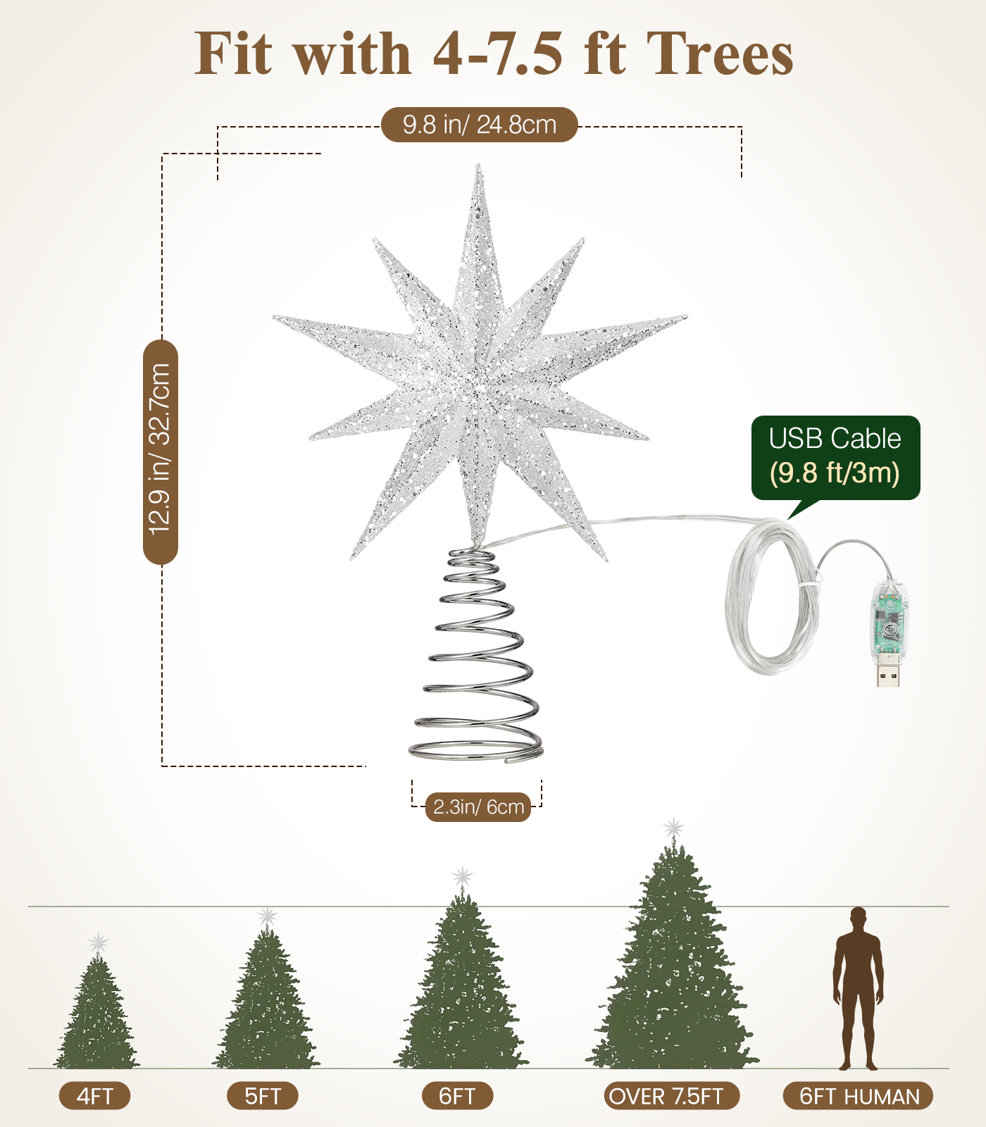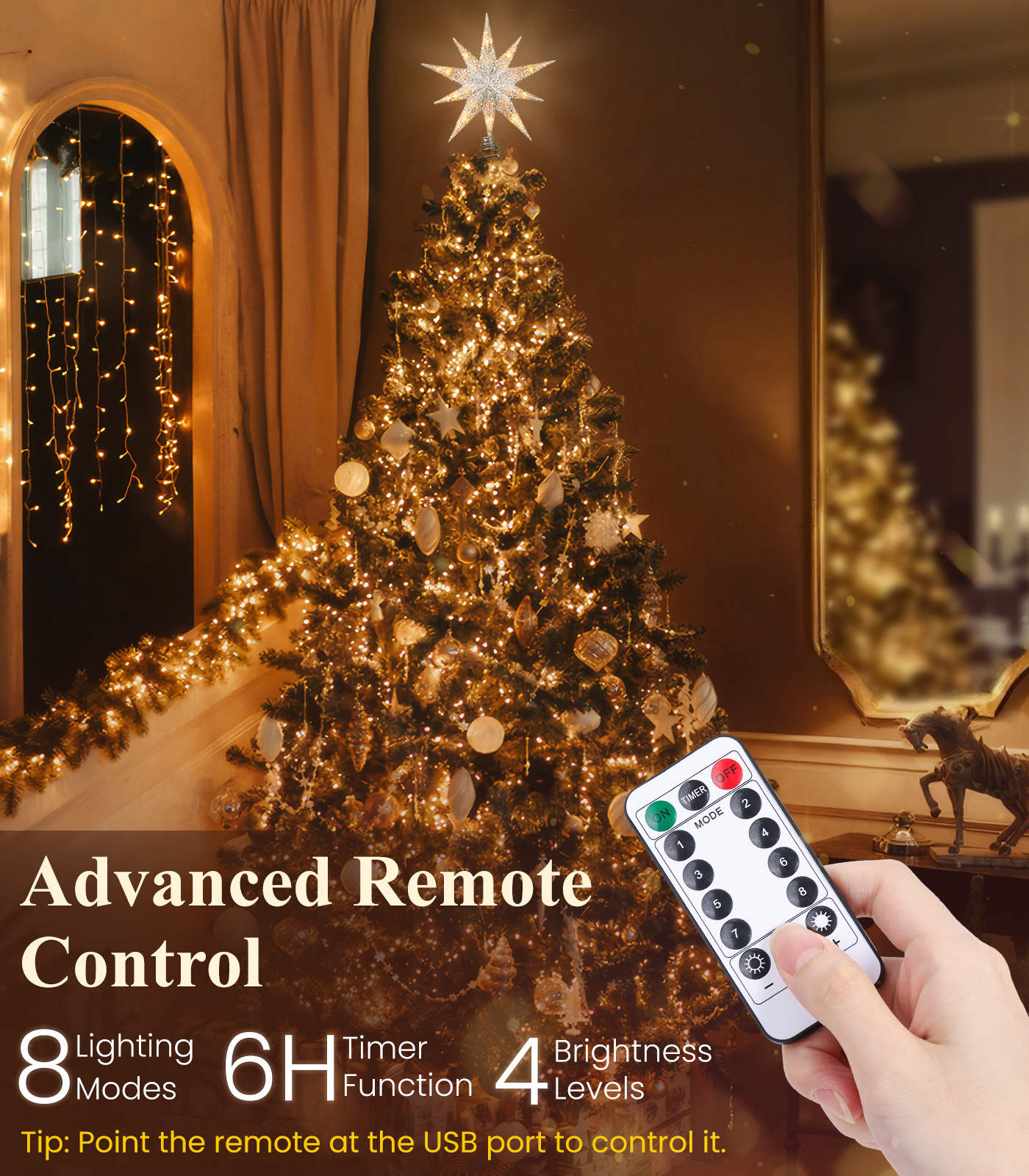 • 【Longer Cable & Remote Control】without frequent replacement of battery, and this silver tree topper is powered by an extra-long 9.8ft USB plug-in cable, long enough to reach the ground and connect the plug. Also, the light up tree topper is equipped with a remote control, which allows you to freely adjust the 4 brightness levels and 8 lighting modes at the push of a button. (Note: To ensure proper operation Please point the remote to the tree topper)
