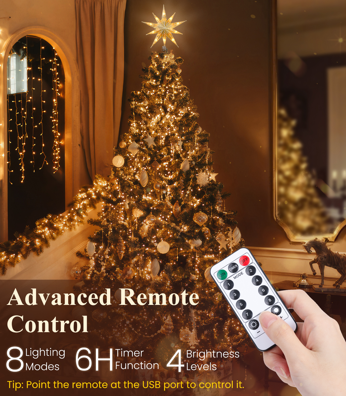 • 【Longer Cable & Remote Control】without frequent replacement of battery, and this champagne gold tree topper is powered by an extra-long 9.8ft USB plug-in cable, long enough to reach the ground and connect the plug. Also, the light up tree topper is equipped with a remote control, which allows you to freely adjust the 4 brightness levels and 8 lighting modes at the push of a button. (Note: To ensure proper operation Please point the remote to the tree topper)